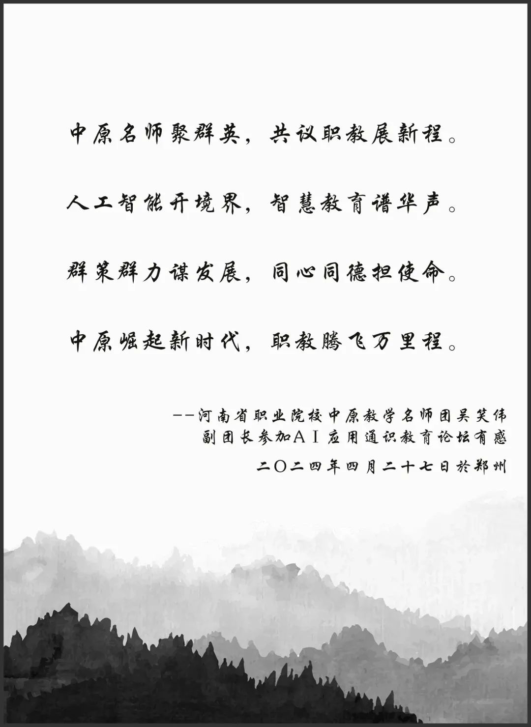小彩蛋:河南省职业院校中原教学名师团吴笑伟副团长参加AI应用通识教育论坛有感,内容由吴团长创作,画作由AI工具辅助制作。